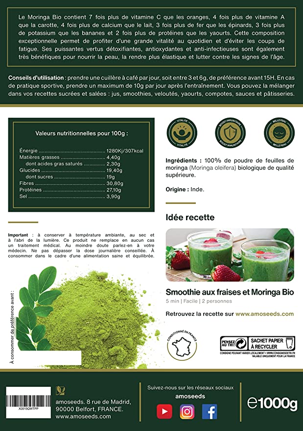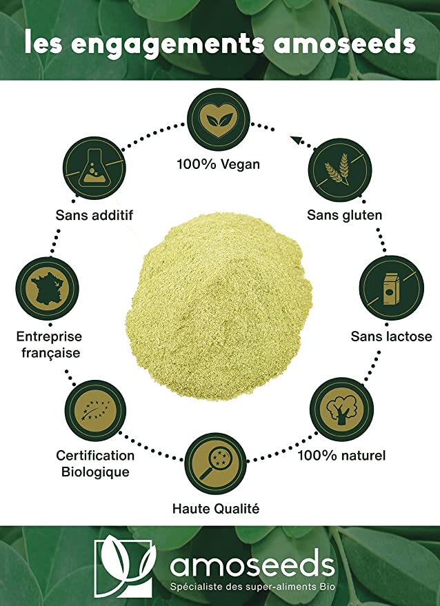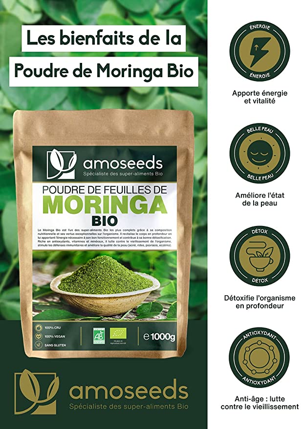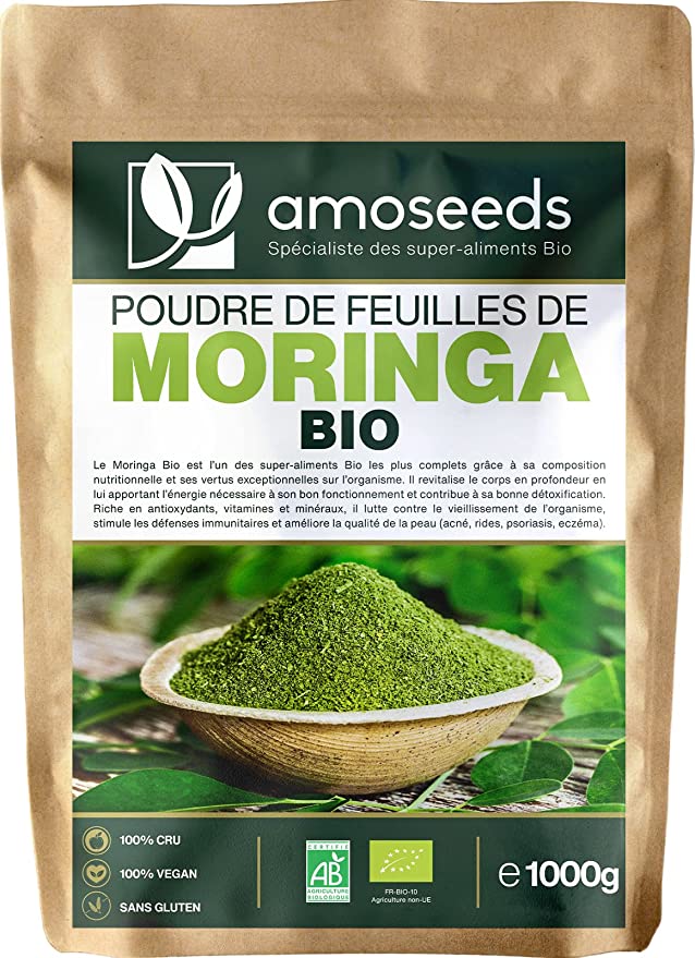 Poudre de feuilles de Moringa Bio 1KG | Vitamine A, Antioxydant, Détox, Peau | Qualité Supérieure